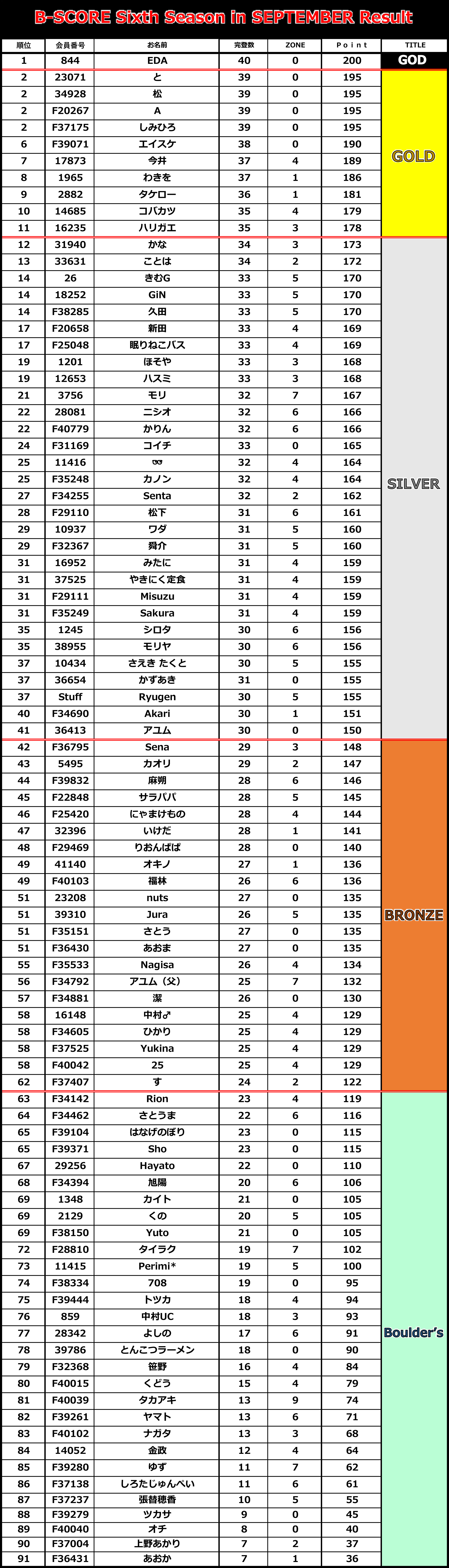 『B-SCORE』Sixth Season September Result