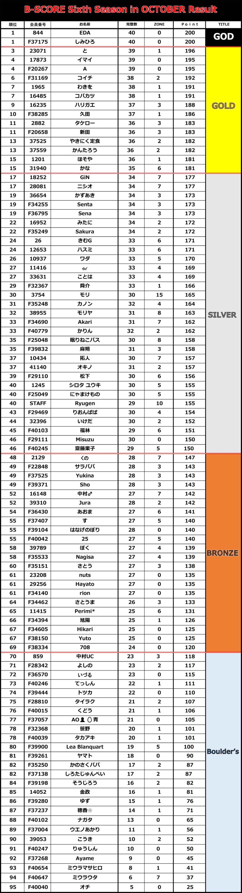 『B-SCORE』Sixth Season October Resultが出ました!!