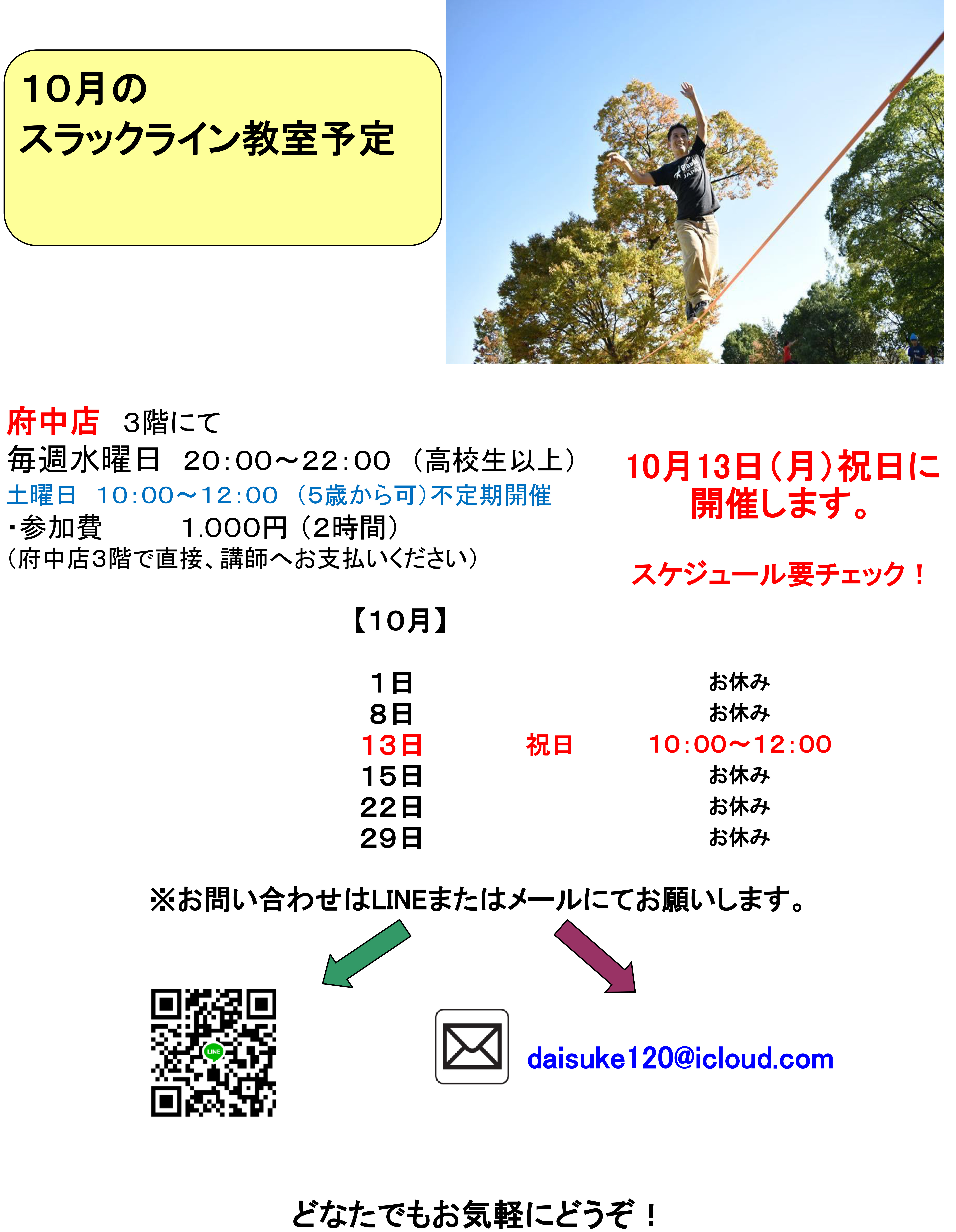 ウエストロック > お知らせ > 未分類 > 10月のスラックラインスクール スケジュール