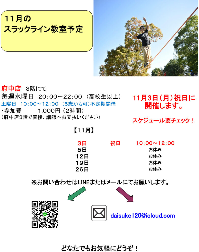 - 11月のスラックラインスクール スケジュール