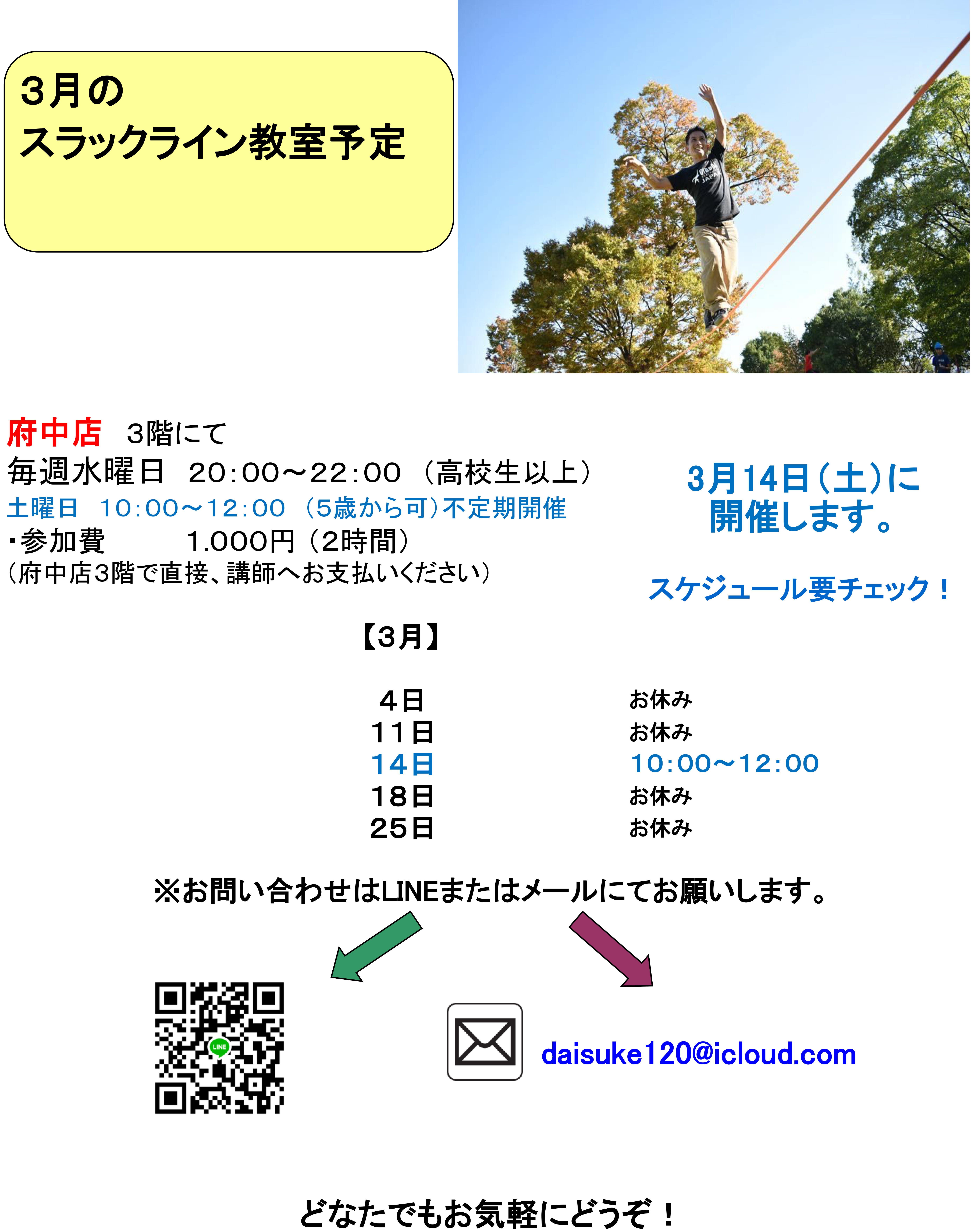 ウエストロック > お知らせ > 未分類 > 3月のスラックラインスクール スケジュール