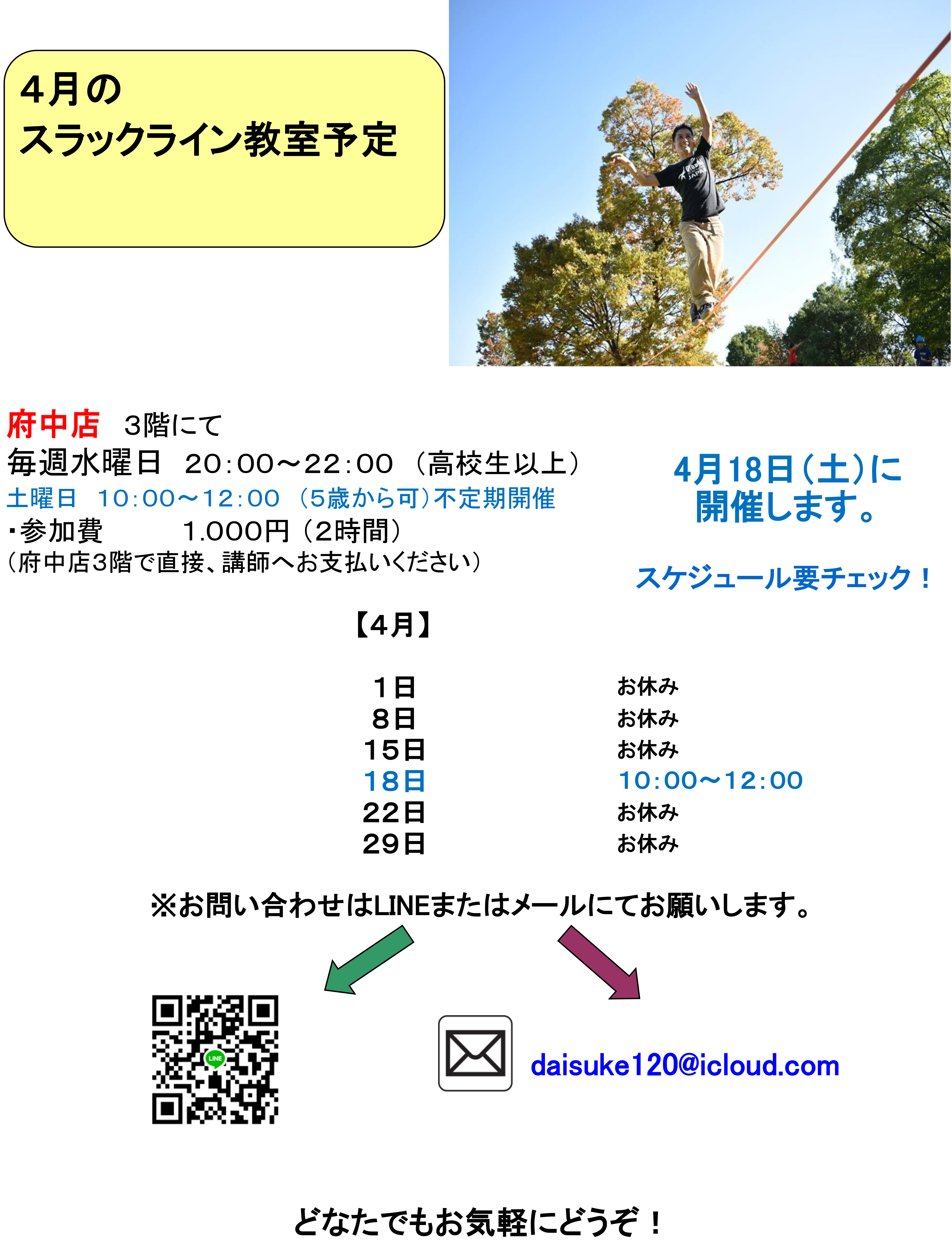 4月のスラックラインスクール スケジュール