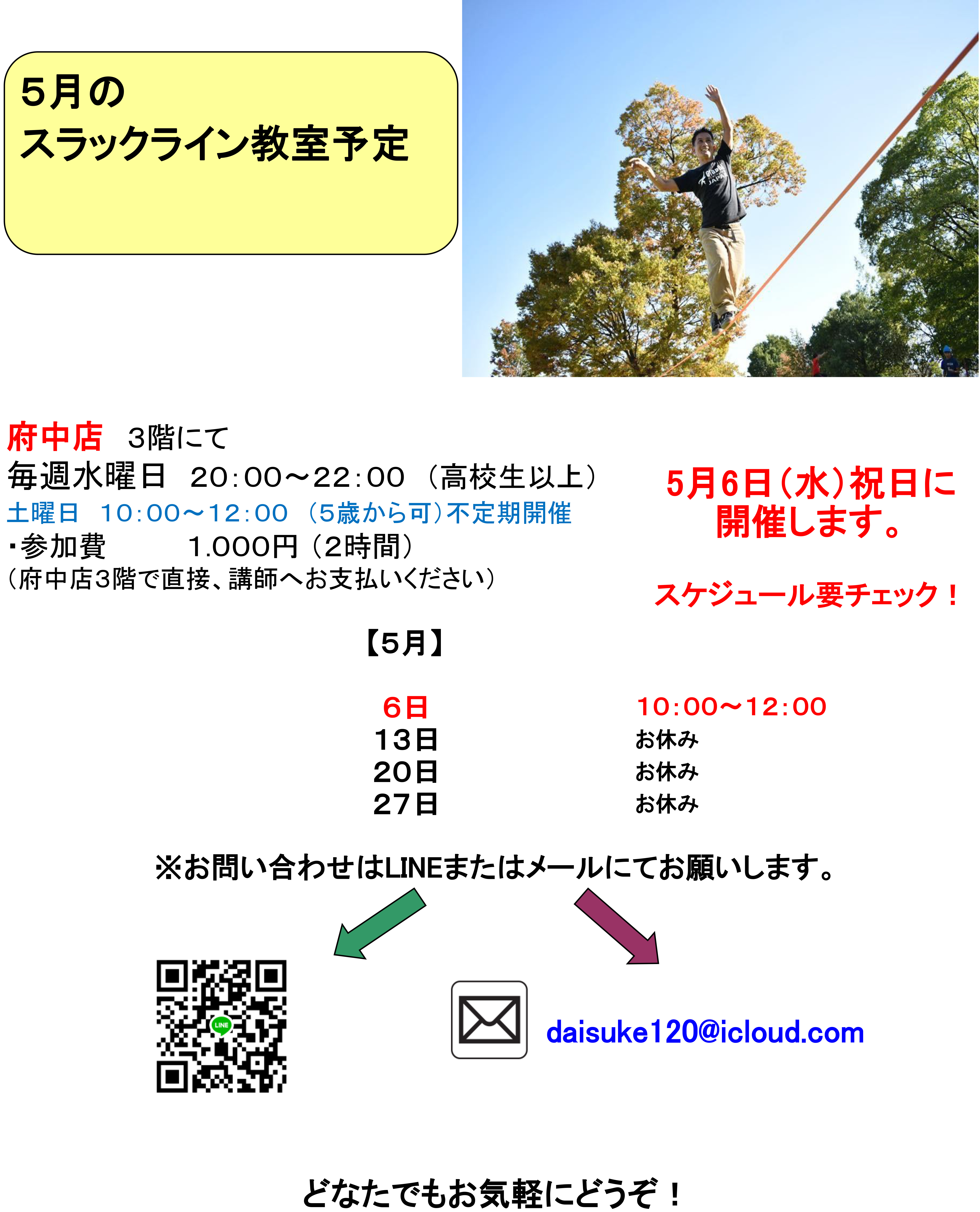 5月のスラックラインスクールのスケジュールが出ました!