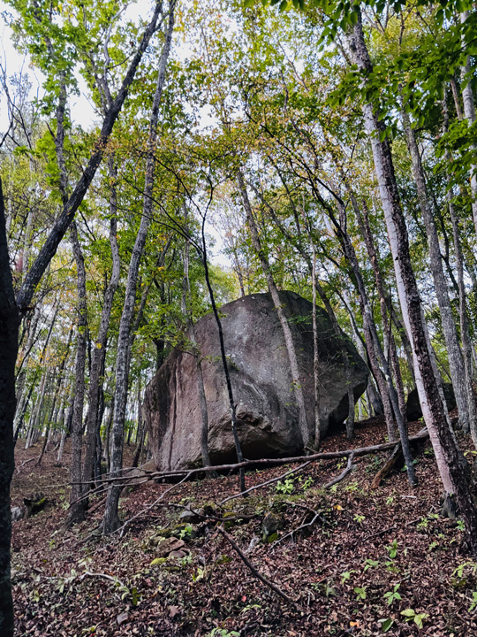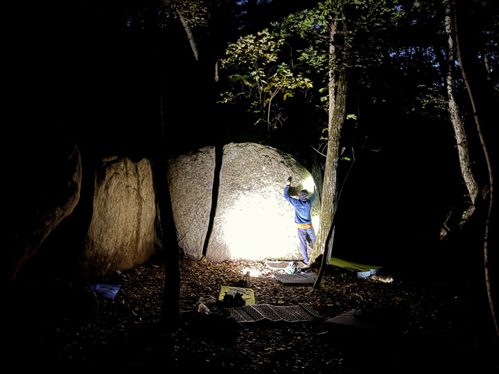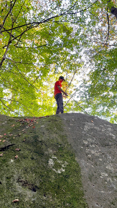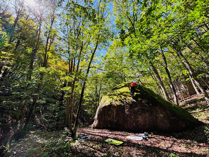 天気は良いものの、前日の雨により岩は少々ウェット、おまけに奥まったエリア故に訪れる人が少ないのか、河原沿いにあるボルダーだからなのか、かなりの岩が綺麗な緑苔に覆われていて、更には岩に積もった落ち葉が水気を含みとても清涼感溢れるクライミングとなった。