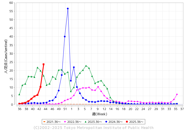 感染者数が爆発的だった2024年と比較しても、明らかに早いタイミングから流行り始めてます。