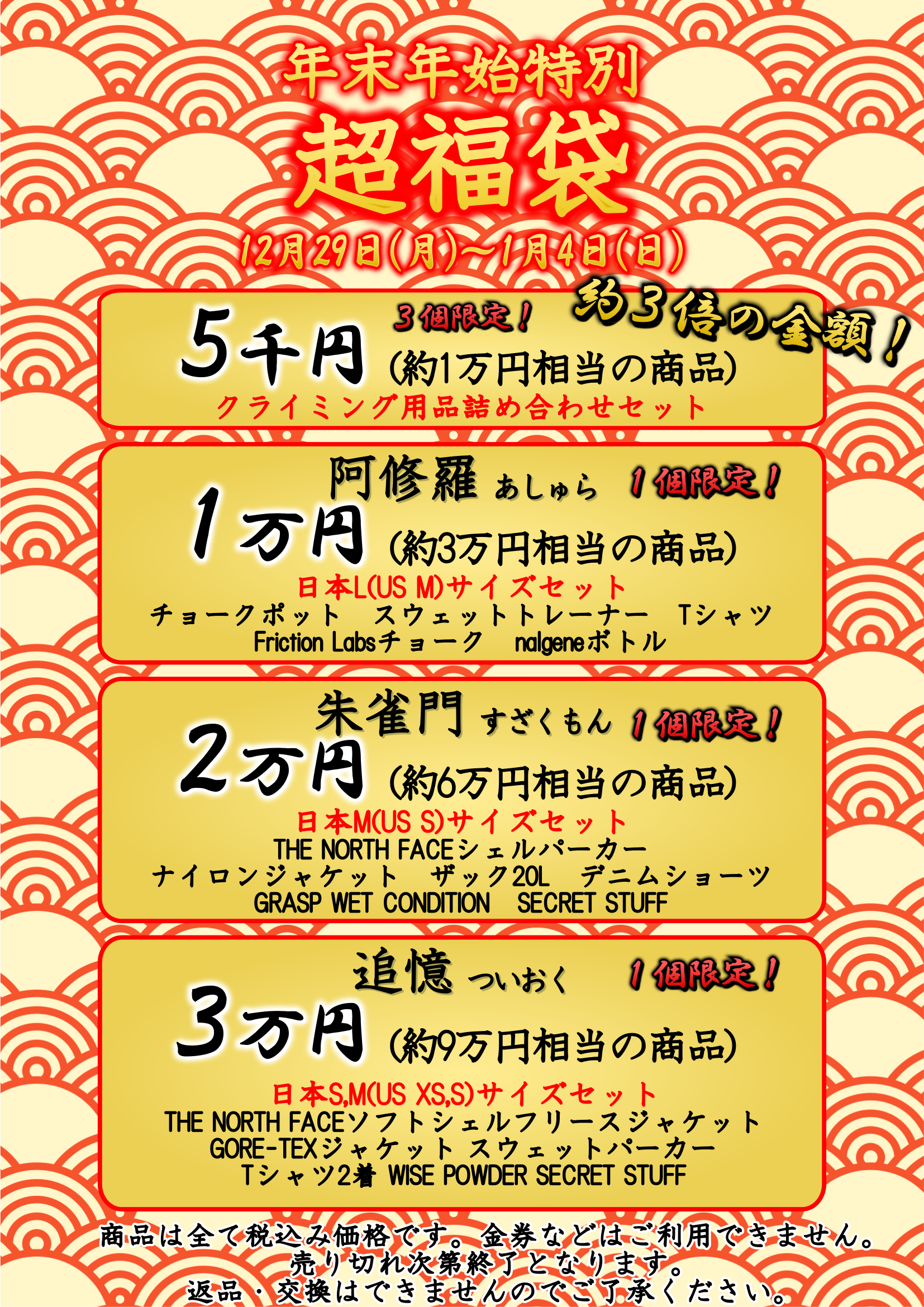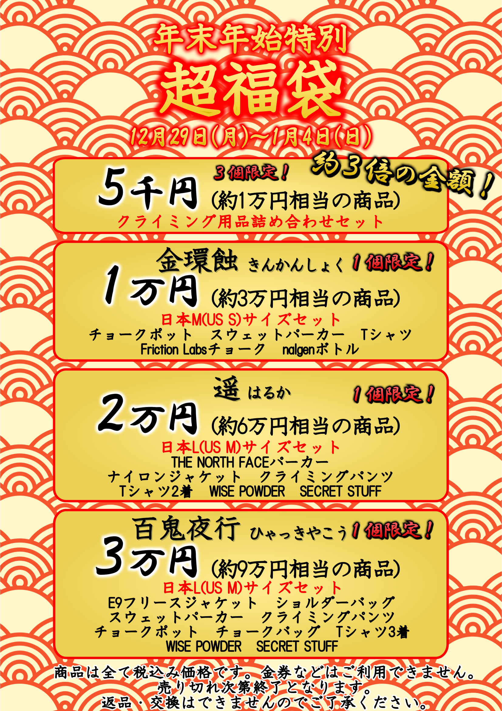 1万円、2万円、3万円の福袋は各店舗1つずつ限定販売!!