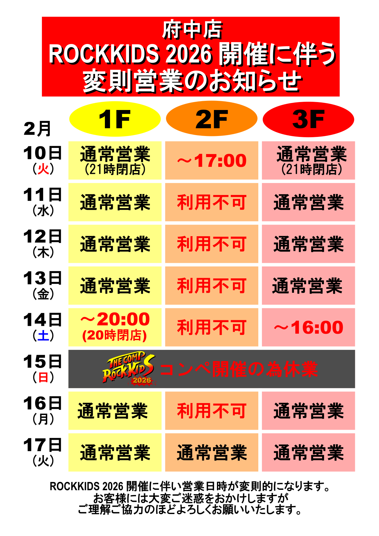 【ROCK KIDS2026】開催に伴い、府中店では前後の日程で